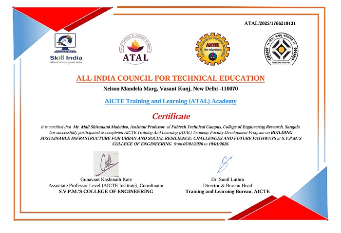 Certificate for FDP on "Sustainable Engineering for Future Infrastructure"