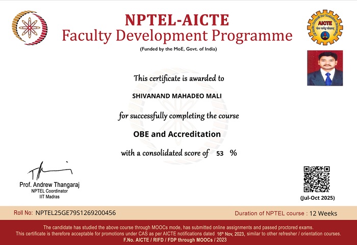 Mr. Mali Shivanand Mahadeo Successfully completed NPTEL course Geology & Soil Mechanics